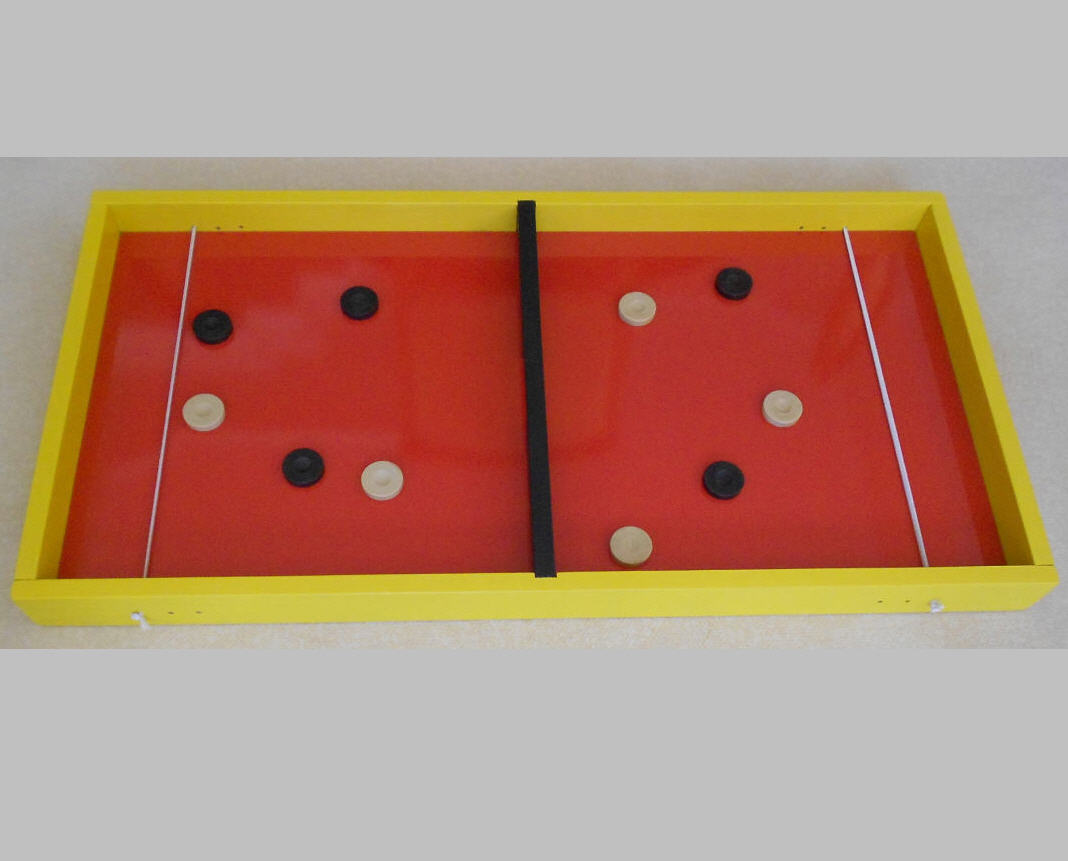 Players place 5 discs on their own field and try to throw them with the help of rubber bands to pass them through the gap in the middle barrier to the opponent's field.